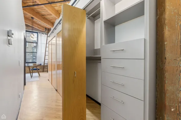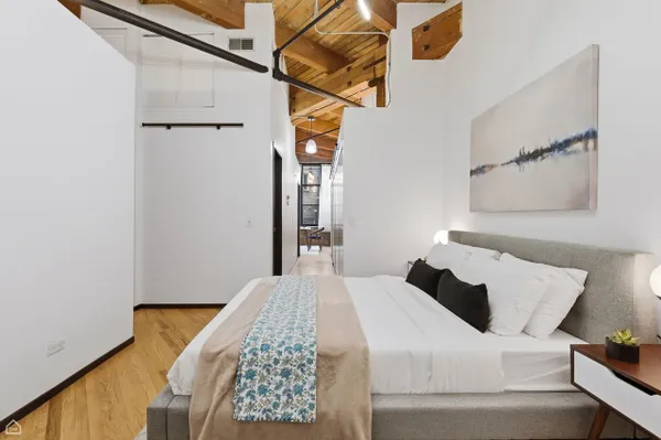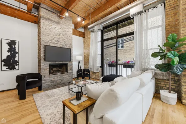 At last! A flexible 2-bedroom, 1.5-bath home (currently configured as a 1-bedroom) in the beloved brick-and-timber Clock Tower Lofts is available for the first time in years. Located on a quiet tree-lined street in the heart of Bucktown, this condo combines true loft character - soaring 14' original timber ceilings, exposed brick, oversized windows, cozy gas start wood-burning fireplace, and refinished hardwood floors (2024) - with smart updates and everyday comfort. The bright, open-concept kitchen and living space are ideal for entertaining, featuring a large stone island, new backsplash, and stainless-steel appliances (refrigerator & dishwasher, 2024) and Juliet balcony. The freshly painted primary bedroom is spacious, connects to the newly renovated bathroom (2024), and features professionally organized closets. Additional storage abounds through the efficient use of high ceilings and a beautiful library track-and-ladder system, providing easy access to generous overhead storage. With one simple wall (see floor plan) the condo converts back to 2-bedroom, if desired. A convenient half bath and in-unit washer and dryer elevate the livability and charm. Recent mechanical upgrades include a new furnace and humidifier in 2026. One deeded parking space and a storage unit are included in the list price. This well-run building offers an exercise room, a common rooftop deck with a grill and beautiful views of the Chicago skyline, composting, and internet package in the lower HOA dues ($426.62/month). Pet-friendly and no rental cap, this condo is perfectly positioned in Bucktown, yet steps from Wicker Park, the 606, neighborhood hotspots, boutiques, cafes, parks, the Blue Line, and Pulaski Elementary School. If you're looking for a historical Chicago loft, look no further!